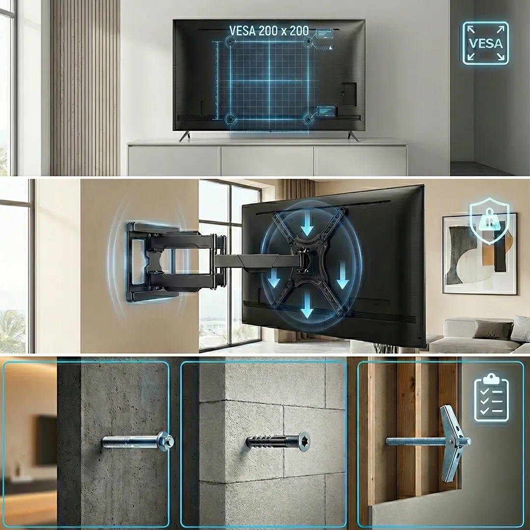 ข้อควรระวัง: อย่าคาดเดาจากขนาดนิ้วทีวีเพียงอย่างเดียว เพราะทีวี 55 นิ้วบางรุ่นอาจมี VESA 200×200 ในขณะที่บางรุ่นอาจเป็น 400×400 การเลือกขาแขวนที่มีค่า VESA ครอบคลุมระยะที่คุณวัดได้ จะทำให้คุณติดตั้งได้ชัวร์โดยไม่ต้องดัดแปลงครับ