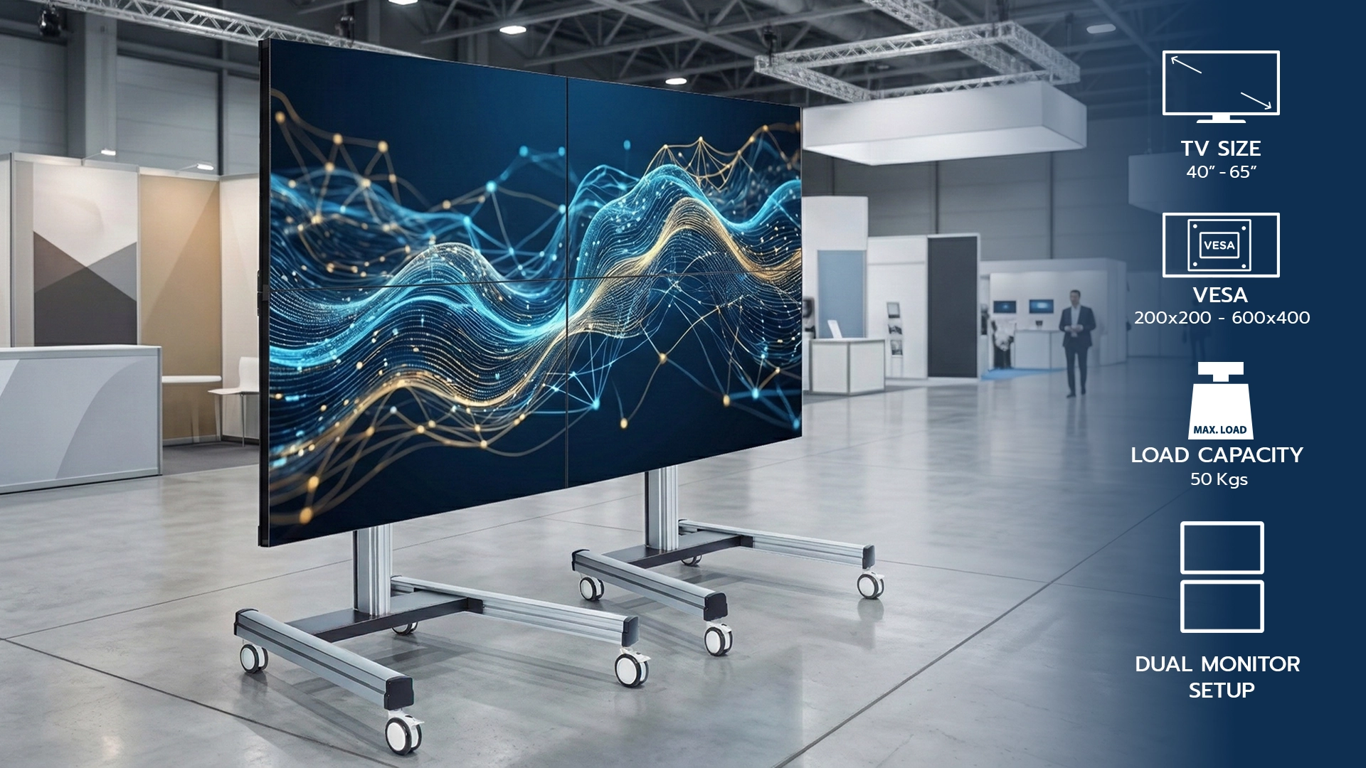 สามารถประยุกต์ใช้งานได้หลากหลาย เหมาะกับบริเวณพื้นที่จำกัดที่ไม่สามารถติด VIDEO WALL ได้ หรือไม่ได้ต้องการติดแบบถาวร รวมทั้งอยากให้สะดวกต่อการเคลื่อนย้าย